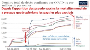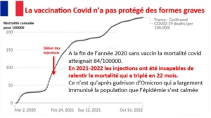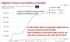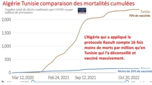 Dans cette discordance de mortalité covid par million entre pays, l’interdiction des traitements précoces et la politique du tout vaccin ont apparemment joué le rôle majeur. La comparaison entre la France, très vaccinée, et l’Algérie, peu vaccinée mais qui a utilisé le traitement Raoult,  montre que la mortalité cumulée par million de cette dernière était, après plus de 20 mois de vaccination, 22 fois inférieure à la nôtre alors que les pourcentages de plus de 65 ans sont très proches.