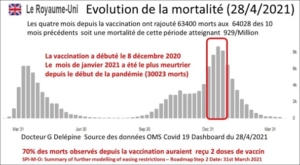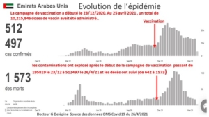 Aux Emirats Arabes Unis [10] la vaccination a été suivie d’une augmentation considérable de la mortalité journalière passant de 3 le 23 décembre 2020, à 20 le 23 février 2021. Le 23 décembre avant la vaccination, après neuf mois d’épidémie, les Émirats arabes unis comptaient 642 morts attribuées au Covid-19. En deux mois post-vaccination, ce chiffre a doublé atteignant 1 182 (+100 %).